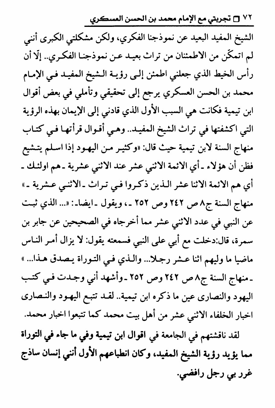 نام کتاب : تجربتي مع الامام محمد بن الحسن العسكري ، المنهج الصحيح في عرض حقيقة غيبة الإمام المهدي على الوهابيين نویسنده : الدكتور عصام العماد جلد : 1 صفحه : 72