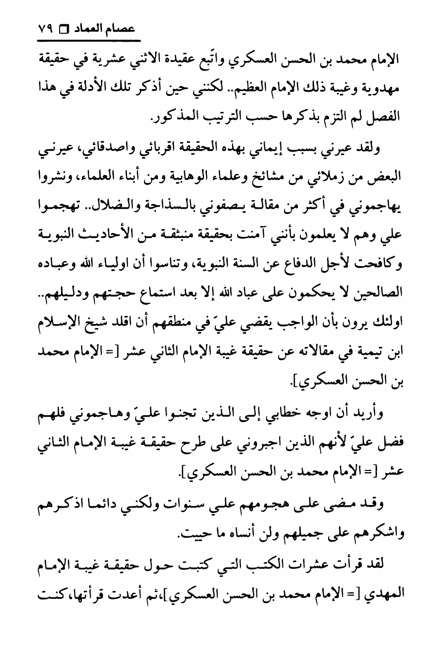 نام کتاب : تجربتي مع الامام محمد بن الحسن العسكري ، المنهج الصحيح في عرض حقيقة غيبة الإمام المهدي على الوهابيين نویسنده : الدكتور عصام العماد جلد : 1 صفحه : 79