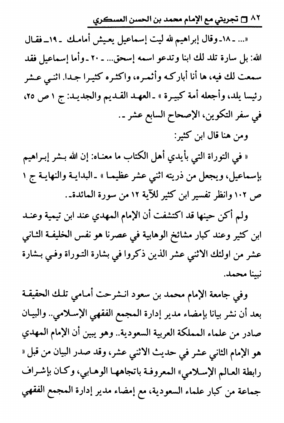 نام کتاب : تجربتي مع الامام محمد بن الحسن العسكري ، المنهج الصحيح في عرض حقيقة غيبة الإمام المهدي على الوهابيين نویسنده : الدكتور عصام العماد جلد : 1 صفحه : 82