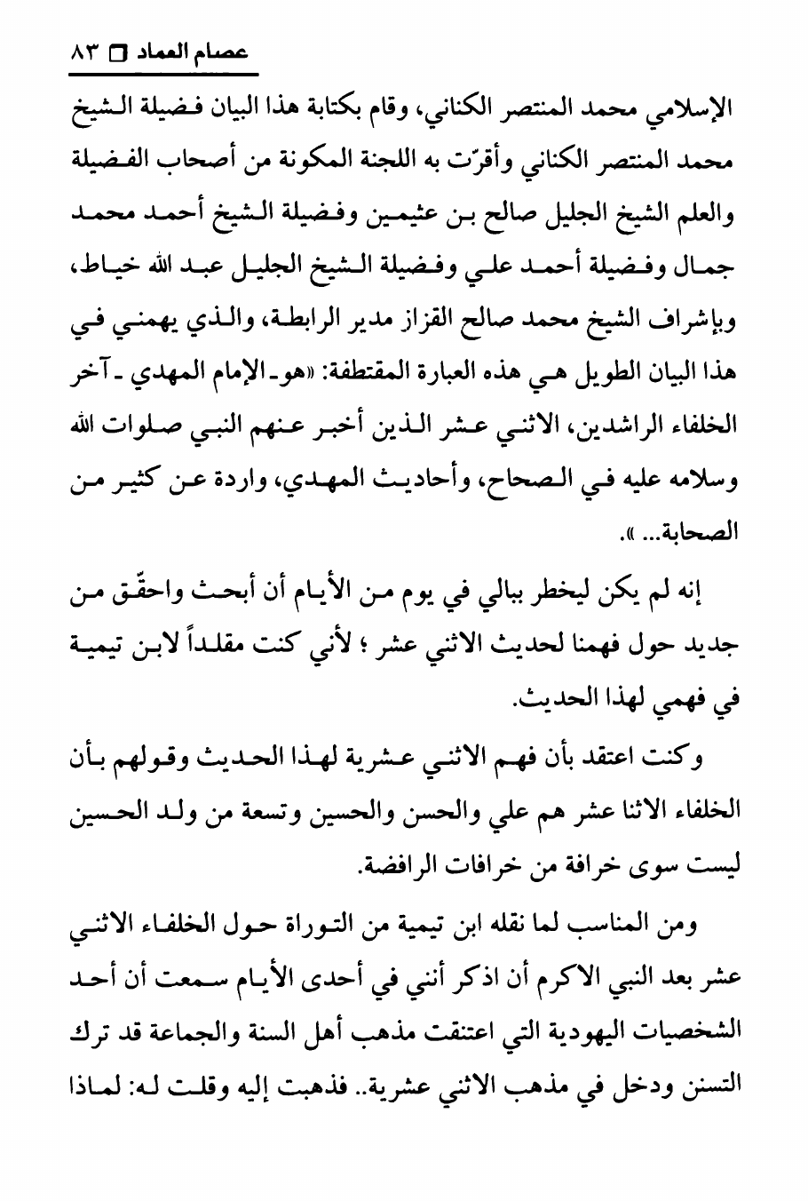 نام کتاب : تجربتي مع الامام محمد بن الحسن العسكري ، المنهج الصحيح في عرض حقيقة غيبة الإمام المهدي على الوهابيين نویسنده : الدكتور عصام العماد جلد : 1 صفحه : 83