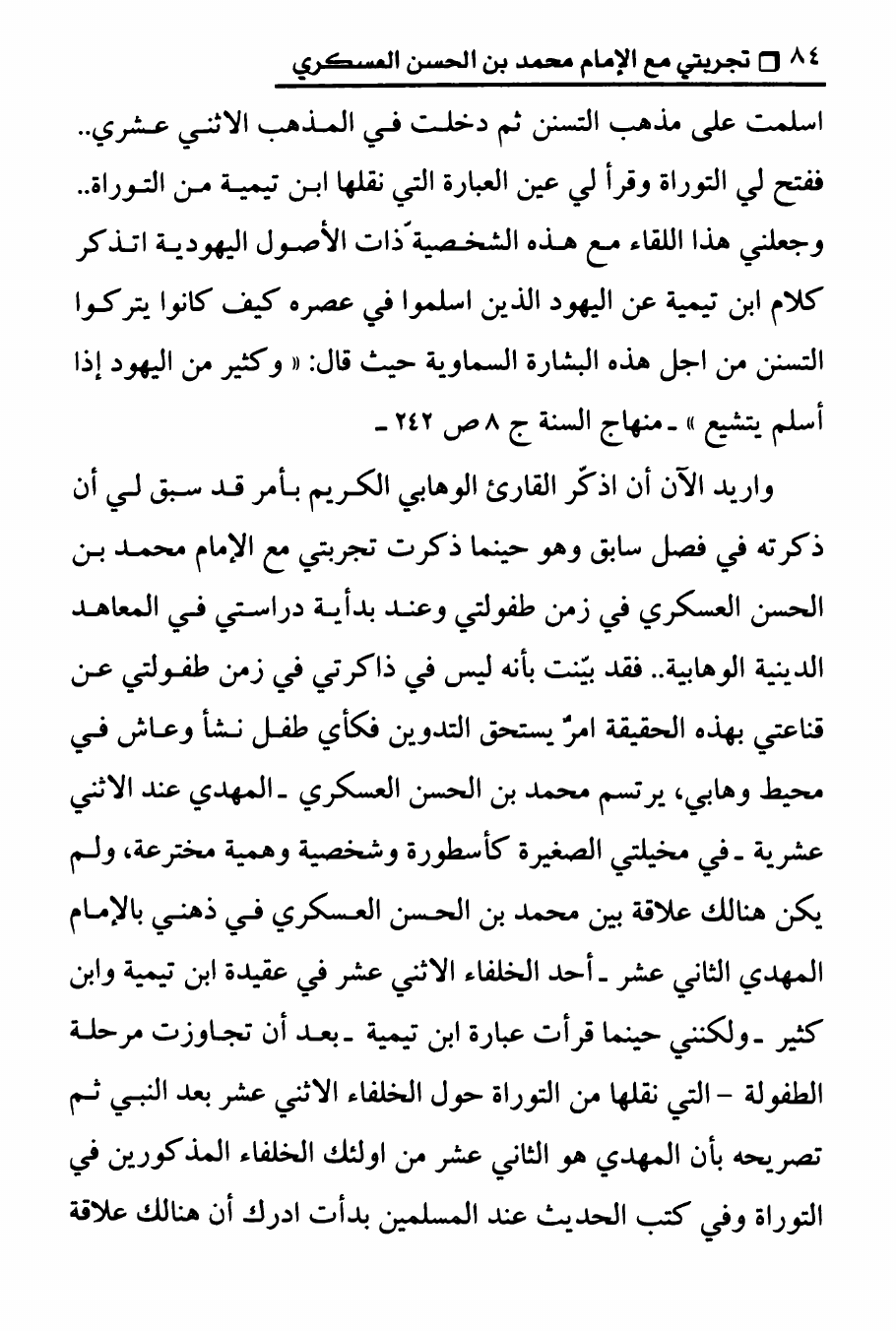 نام کتاب : تجربتي مع الامام محمد بن الحسن العسكري ، المنهج الصحيح في عرض حقيقة غيبة الإمام المهدي على الوهابيين نویسنده : الدكتور عصام العماد جلد : 1 صفحه : 84
