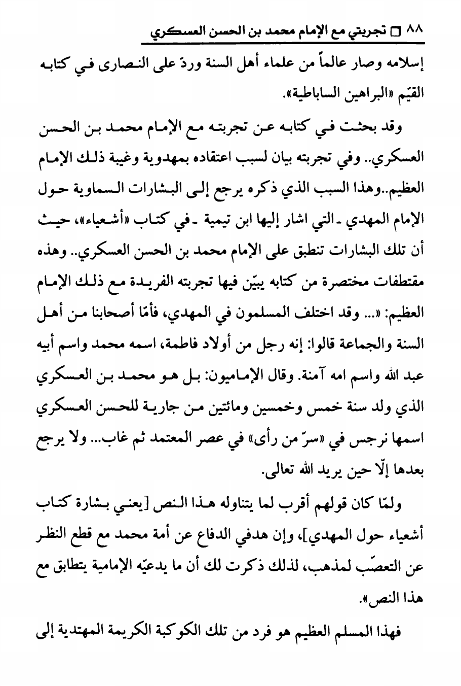 نام کتاب : تجربتي مع الامام محمد بن الحسن العسكري ، المنهج الصحيح في عرض حقيقة غيبة الإمام المهدي على الوهابيين نویسنده : الدكتور عصام العماد جلد : 1 صفحه : 88