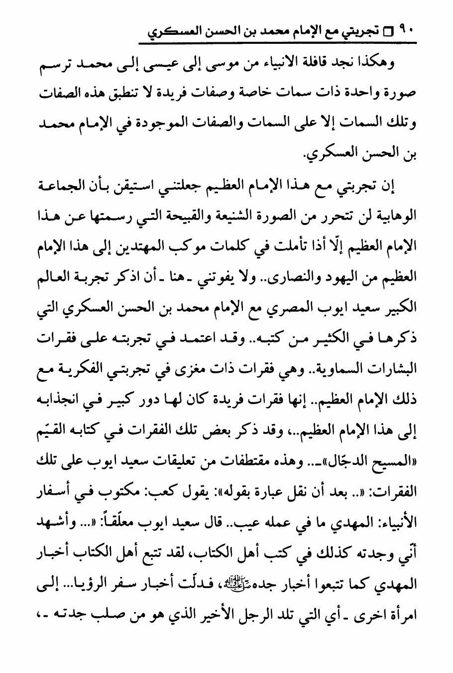 نام کتاب : تجربتي مع الامام محمد بن الحسن العسكري ، المنهج الصحيح في عرض حقيقة غيبة الإمام المهدي على الوهابيين نویسنده : الدكتور عصام العماد جلد : 1 صفحه : 90