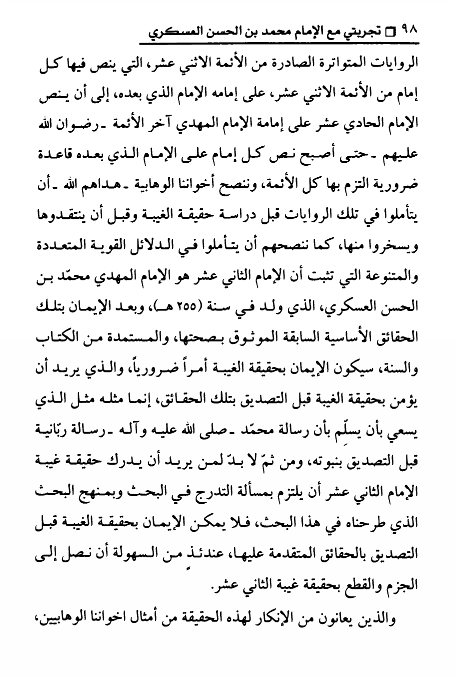 نام کتاب : تجربتي مع الامام محمد بن الحسن العسكري ، المنهج الصحيح في عرض حقيقة غيبة الإمام المهدي على الوهابيين نویسنده : الدكتور عصام العماد جلد : 1 صفحه : 98