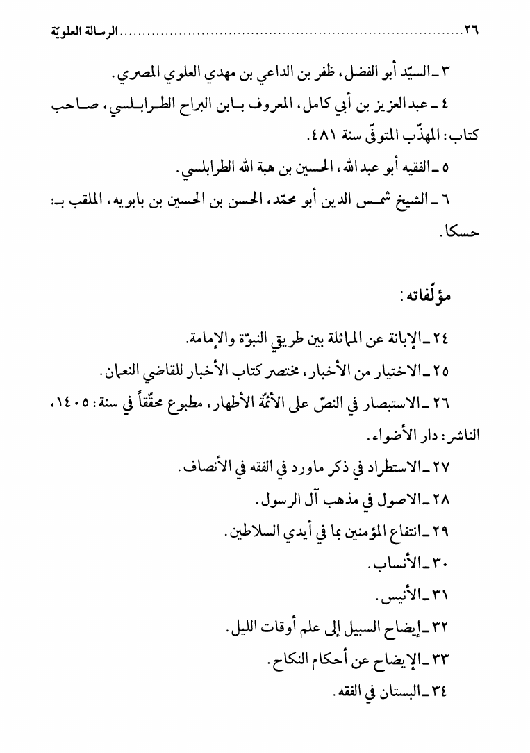 نام کتاب : الرسالة العلوية، في فضل أمير المؤمنين على سائر البرية، سوى سيدنا رسول الله ص نویسنده : الشيخ محمد بن علي الكراجكي الطرابلسي جلد : 1 صفحه : 26