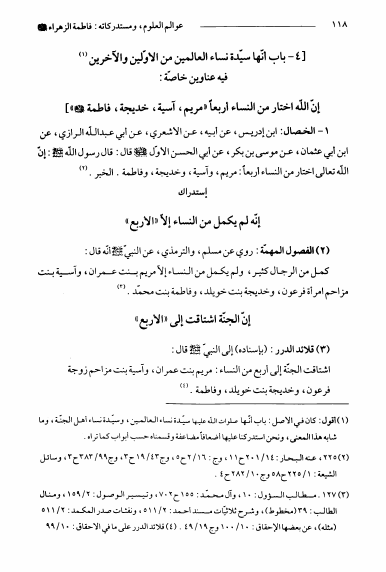 نام کتاب : عوالم العلوم و المعارف و الأحوال من الأيات و الأخبار و الأقوال ج11، سيدة النساء فاطمة الزهراء و مستدركاتها نویسنده : الشيخ عبدالله البحراني جلد : 1 صفحه : 118