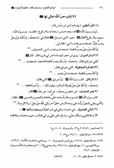 نام کتاب : عوالم العلوم و المعارف و الأحوال من الأيات و الأخبار و الأقوال ج11، سيدة النساء فاطمة الزهراء و مستدركاتها نویسنده : الشيخ عبدالله البحراني جلد : 1 صفحه : 160