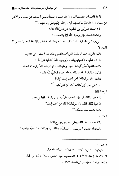 نام کتاب : عوالم العلوم و المعارف و الأحوال من الأيات و الأخبار و الأقوال ج11، سيدة النساء فاطمة الزهراء و مستدركاتها نویسنده : الشيخ عبدالله البحراني جلد : 1 صفحه : 168