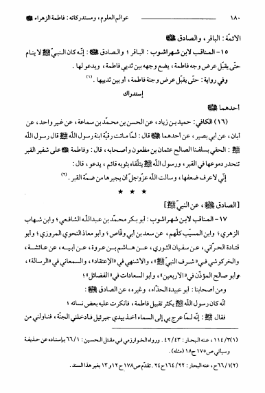 نام کتاب : عوالم العلوم و المعارف و الأحوال من الأيات و الأخبار و الأقوال ج11، سيدة النساء فاطمة الزهراء و مستدركاتها نویسنده : الشيخ عبدالله البحراني جلد : 1 صفحه : 180