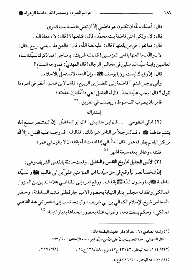 نام کتاب : عوالم العلوم و المعارف و الأحوال من الأيات و الأخبار و الأقوال ج11، سيدة النساء فاطمة الزهراء و مستدركاتها نویسنده : الشيخ عبدالله البحراني جلد : 1 صفحه : 186