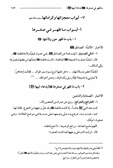 نام کتاب : عوالم العلوم و المعارف و الأحوال من الأيات و الأخبار و الأقوال ج11، سيدة النساء فاطمة الزهراء و مستدركاتها نویسنده : الشيخ عبدالله البحراني جلد : 1 صفحه : 187