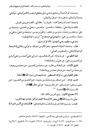 نام کتاب : عوالم العلوم و المعارف و الأحوال من الأيات و الأخبار و الأقوال ج11، سيدة النساء فاطمة الزهراء و مستدركاتها نویسنده : الشيخ عبدالله البحراني جلد : 1 صفحه : 20