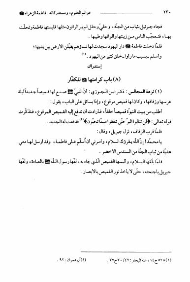نام کتاب : عوالم العلوم و المعارف و الأحوال من الأيات و الأخبار و الأقوال ج11، سيدة النساء فاطمة الزهراء و مستدركاتها نویسنده : الشيخ عبدالله البحراني جلد : 1 صفحه : 230
