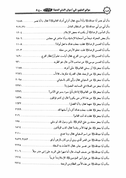 نام کتاب : عوالم العلوم والمعارف والأقوال، من الأيات والأخبار والأقوال، في أحوال الإمام الحجة بن الحسن المهدي ع - 5 أجزاء نویسنده : الشيخ عبدالله البحراني جلد : 5 صفحه : 152