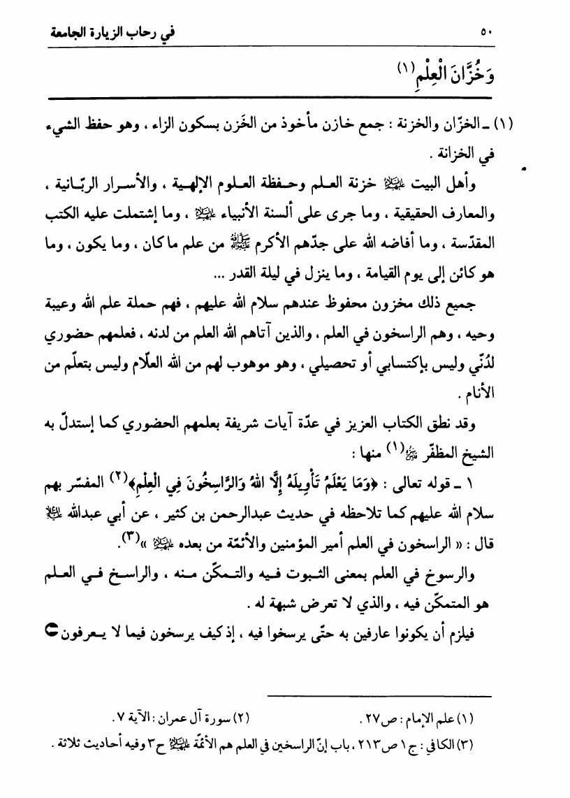 نام کتاب : في رحاب الزيارة الجامعة، البيان الكامل لفضائل أهل البيت ع ومناقبهم الرائعة في زيارتهم الجامعة نویسنده : السيد علي الحسيني الصدر جلد : 1 صفحه : 50