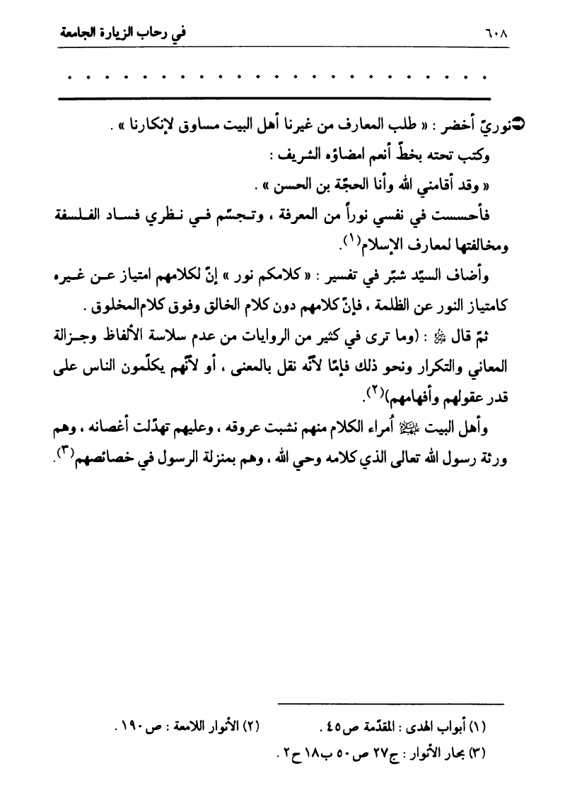 نام کتاب : في رحاب الزيارة الجامعة، البيان الكامل لفضائل أهل البيت ع ومناقبهم الرائعة في زيارتهم الجامعة نویسنده : السيد علي الحسيني الصدر جلد : 1 صفحه : 608