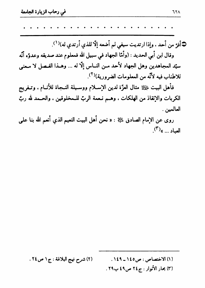 نام کتاب : في رحاب الزيارة الجامعة، البيان الكامل لفضائل أهل البيت ع ومناقبهم الرائعة في زيارتهم الجامعة نویسنده : السيد علي الحسيني الصدر جلد : 1 صفحه : 628