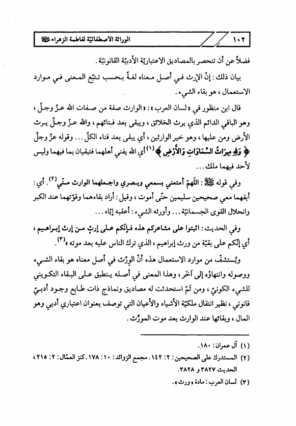 مقامات فاطمة الزهراء ع في الكتاب والسنة، ويليه الوراثة الإصطفائية