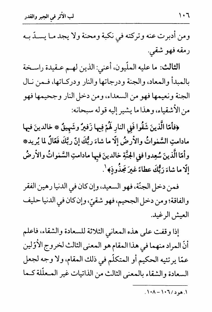 نام کتاب : لب الأثر في الجبر والقدر ، وتليه رسالة أخرى في الأمر بين الأمرين، تقريراً لمحاضرات السيد الخميني نویسنده : الشيخ جعفر السبحاني جلد : 1 صفحه : 106