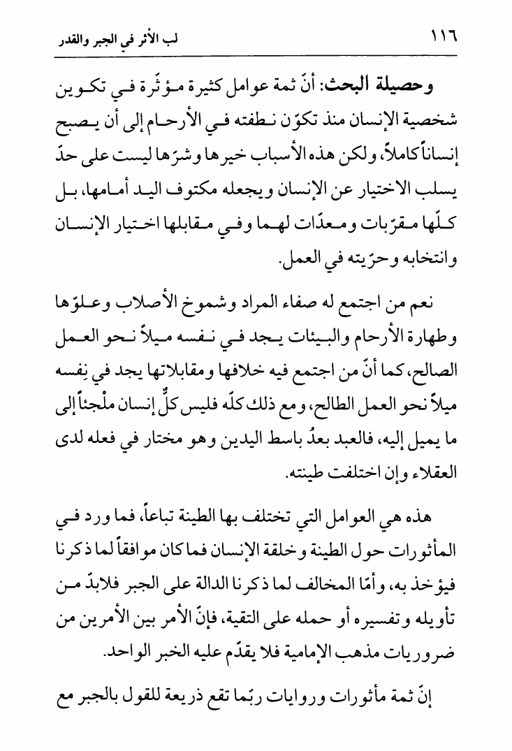 نام کتاب : لب الأثر في الجبر والقدر ، وتليه رسالة أخرى في الأمر بين الأمرين، تقريراً لمحاضرات السيد الخميني نویسنده : الشيخ جعفر السبحاني جلد : 1 صفحه : 116