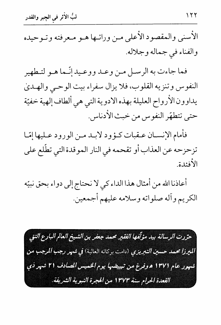 نام کتاب : لب الأثر في الجبر والقدر ، وتليه رسالة أخرى في الأمر بين الأمرين، تقريراً لمحاضرات السيد الخميني نویسنده : الشيخ جعفر السبحاني جلد : 1 صفحه : 122
