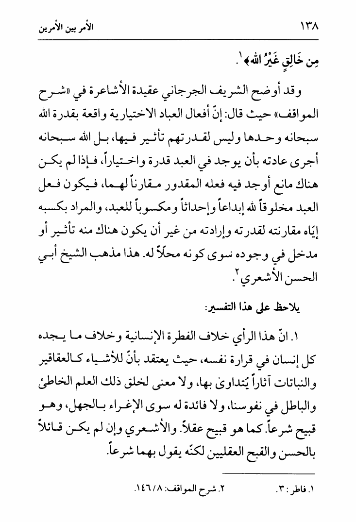 نام کتاب : لب الأثر في الجبر والقدر ، وتليه رسالة أخرى في الأمر بين الأمرين، تقريراً لمحاضرات السيد الخميني نویسنده : الشيخ جعفر السبحاني جلد : 1 صفحه : 138