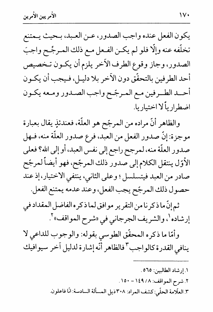 نام کتاب : لب الأثر في الجبر والقدر ، وتليه رسالة أخرى في الأمر بين الأمرين، تقريراً لمحاضرات السيد الخميني نویسنده : الشيخ جعفر السبحاني جلد : 1 صفحه : 170