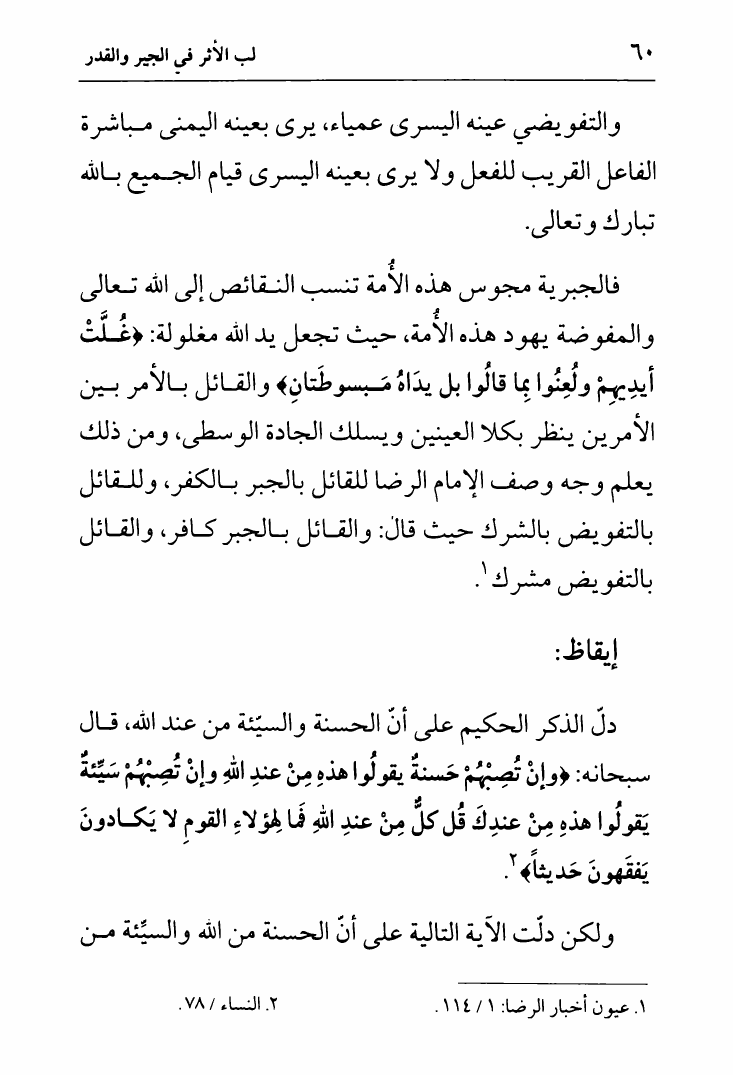 نام کتاب : لب الأثر في الجبر والقدر ، وتليه رسالة أخرى في الأمر بين الأمرين، تقريراً لمحاضرات السيد الخميني نویسنده : الشيخ جعفر السبحاني جلد : 1 صفحه : 60