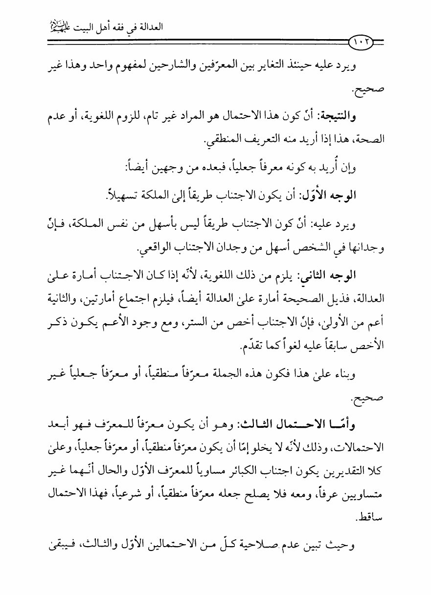 نام کتاب : العدالة في فقه أهل البيت عليهم السلام، تقريراً لبحث أية الله الحاج الشيخ مسلم الداوري نویسنده : الشيخ محمد علي صالح المعلم جلد : 1 صفحه : 102