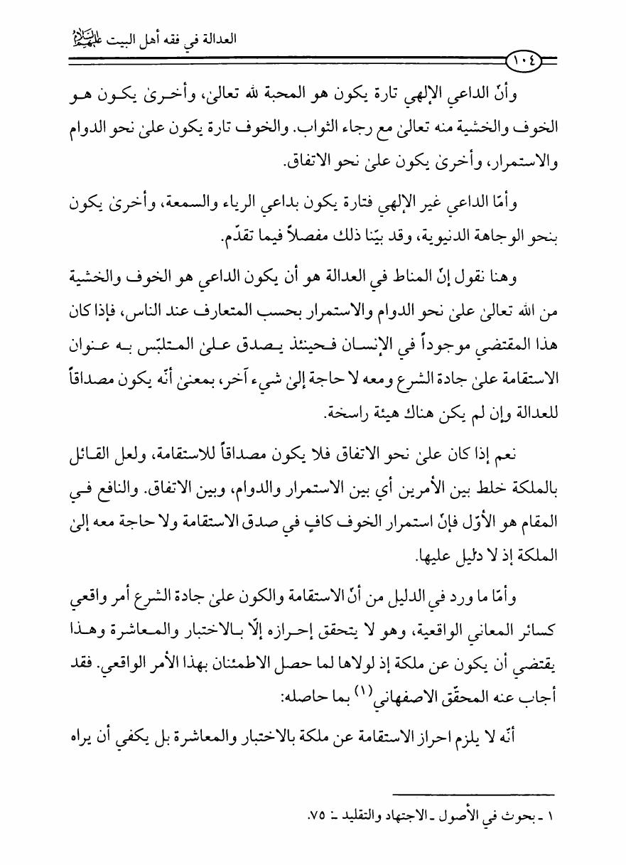 نام کتاب : العدالة في فقه أهل البيت عليهم السلام، تقريراً لبحث أية الله الحاج الشيخ مسلم الداوري نویسنده : الشيخ محمد علي صالح المعلم جلد : 1 صفحه : 104