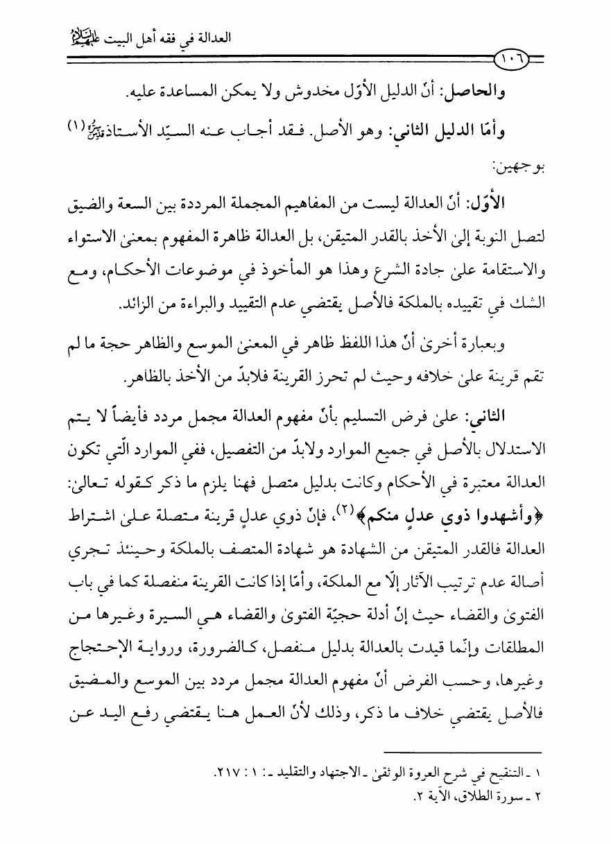 نام کتاب : العدالة في فقه أهل البيت عليهم السلام، تقريراً لبحث أية الله الحاج الشيخ مسلم الداوري نویسنده : الشيخ محمد علي صالح المعلم جلد : 1 صفحه : 106