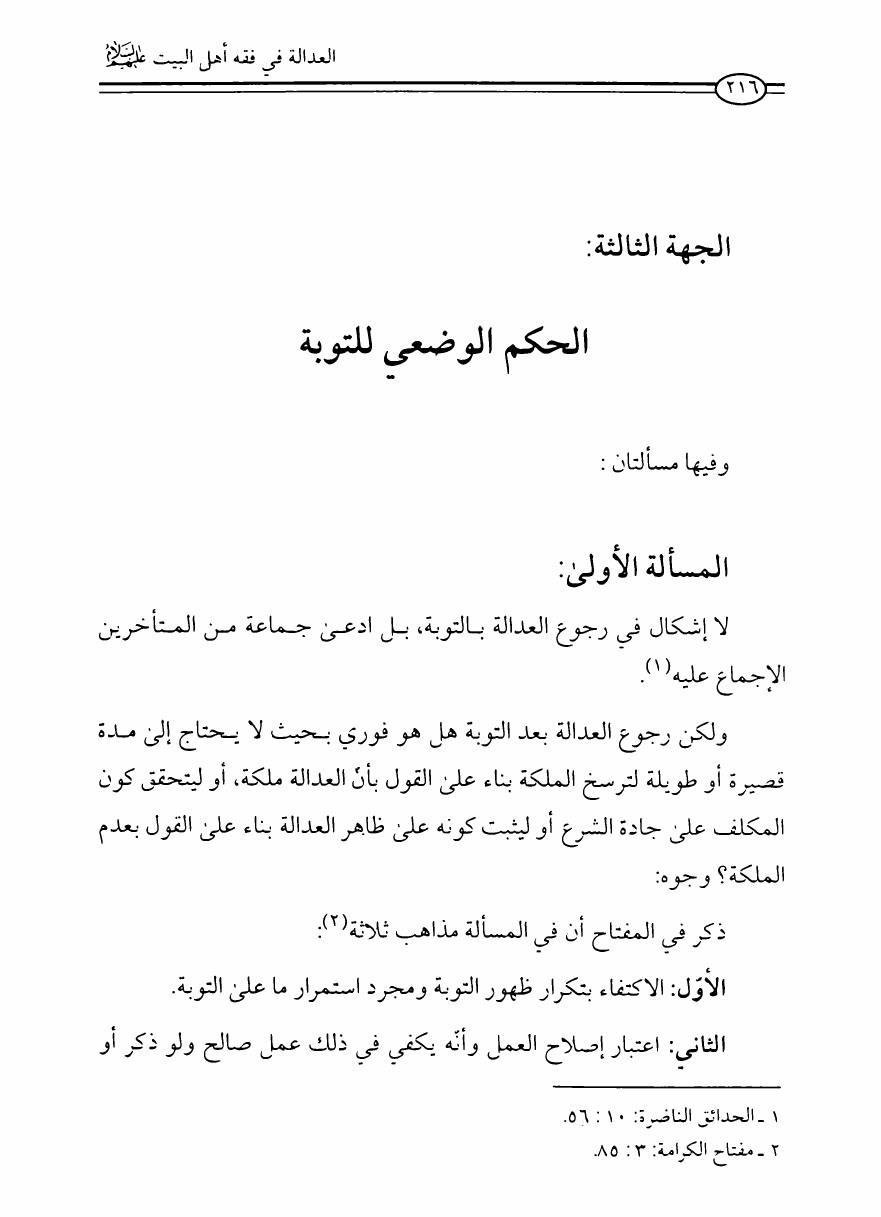 نام کتاب : العدالة في فقه أهل البيت عليهم السلام، تقريراً لبحث أية الله الحاج الشيخ مسلم الداوري نویسنده : الشيخ محمد علي صالح المعلم جلد : 1 صفحه : 216