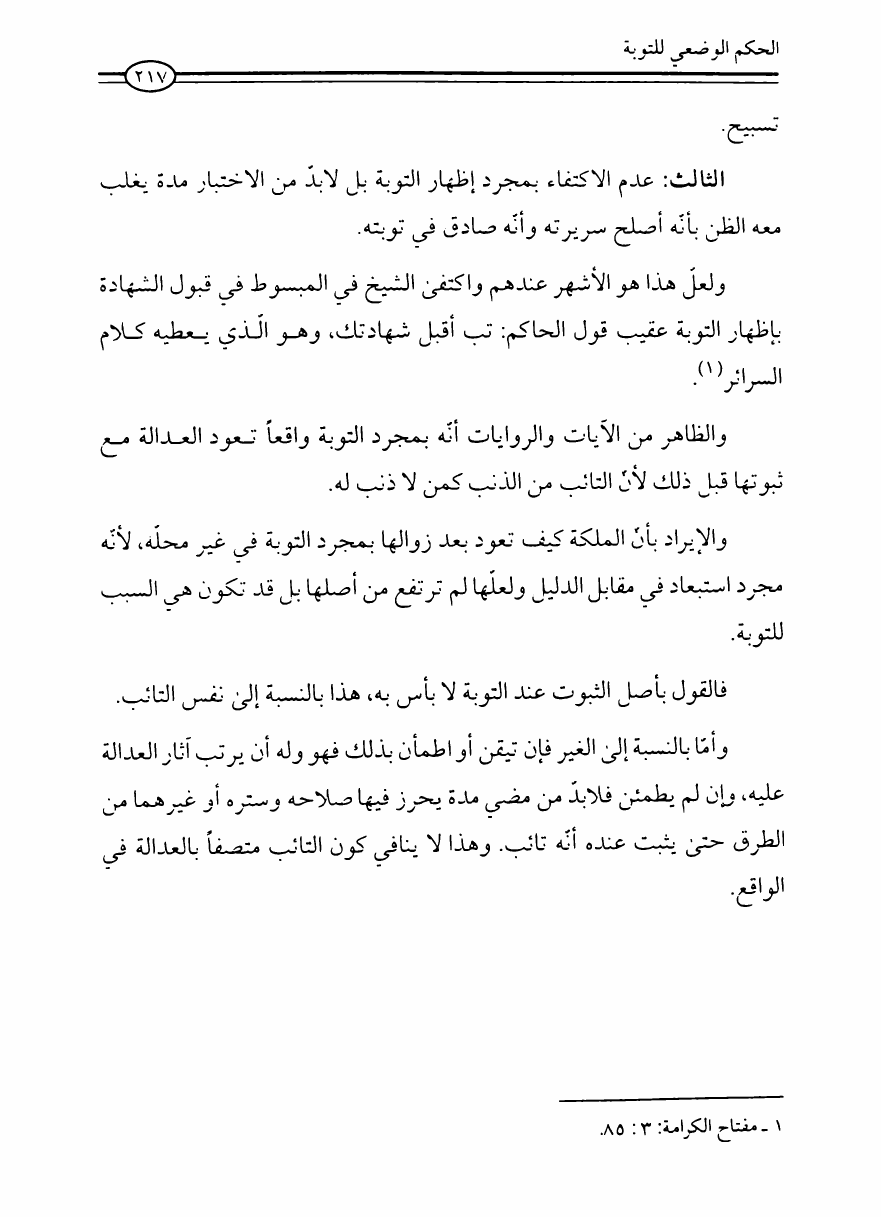 نام کتاب : العدالة في فقه أهل البيت عليهم السلام، تقريراً لبحث أية الله الحاج الشيخ مسلم الداوري نویسنده : الشيخ محمد علي صالح المعلم جلد : 1 صفحه : 217