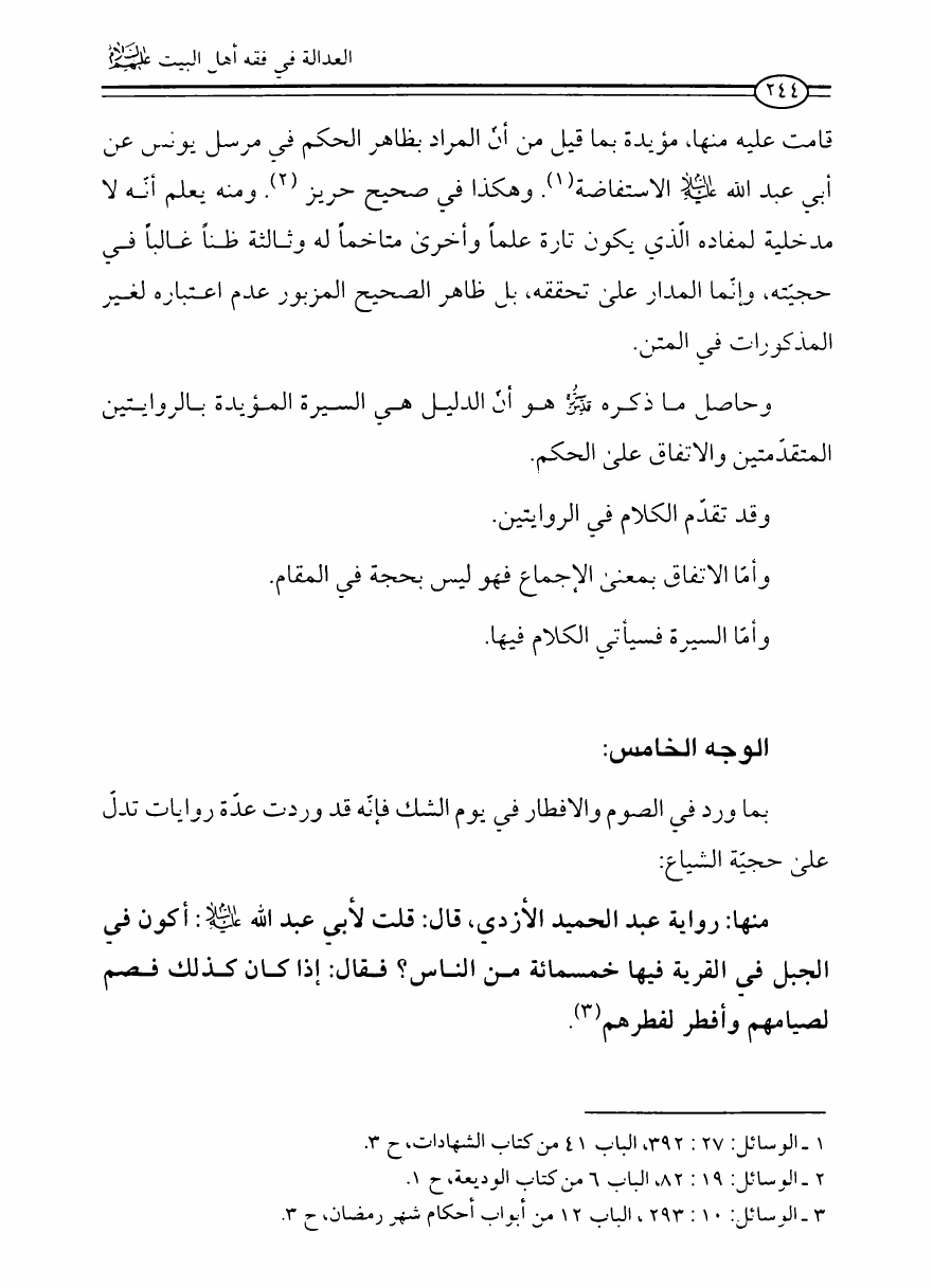 نام کتاب : العدالة في فقه أهل البيت عليهم السلام، تقريراً لبحث أية الله الحاج الشيخ مسلم الداوري نویسنده : الشيخ محمد علي صالح المعلم جلد : 1 صفحه : 244