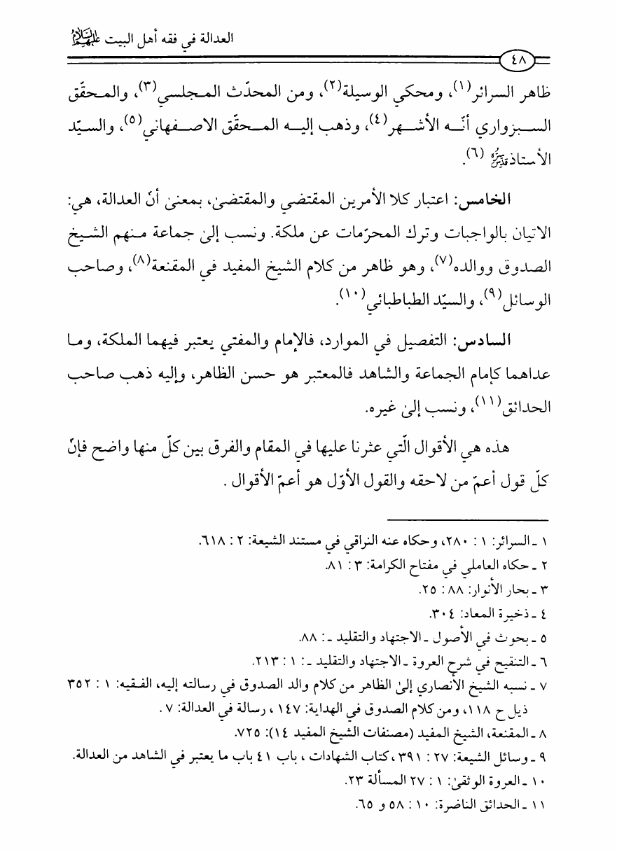 نام کتاب : العدالة في فقه أهل البيت عليهم السلام، تقريراً لبحث أية الله الحاج الشيخ مسلم الداوري نویسنده : الشيخ محمد علي صالح المعلم جلد : 1 صفحه : 48