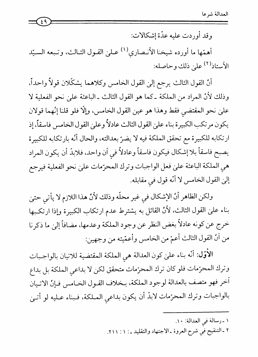 نام کتاب : العدالة في فقه أهل البيت عليهم السلام، تقريراً لبحث أية الله الحاج الشيخ مسلم الداوري نویسنده : الشيخ محمد علي صالح المعلم جلد : 1 صفحه : 49