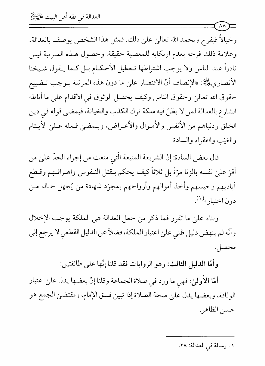 نام کتاب : العدالة في فقه أهل البيت عليهم السلام، تقريراً لبحث أية الله الحاج الشيخ مسلم الداوري نویسنده : الشيخ محمد علي صالح المعلم جلد : 1 صفحه : 88