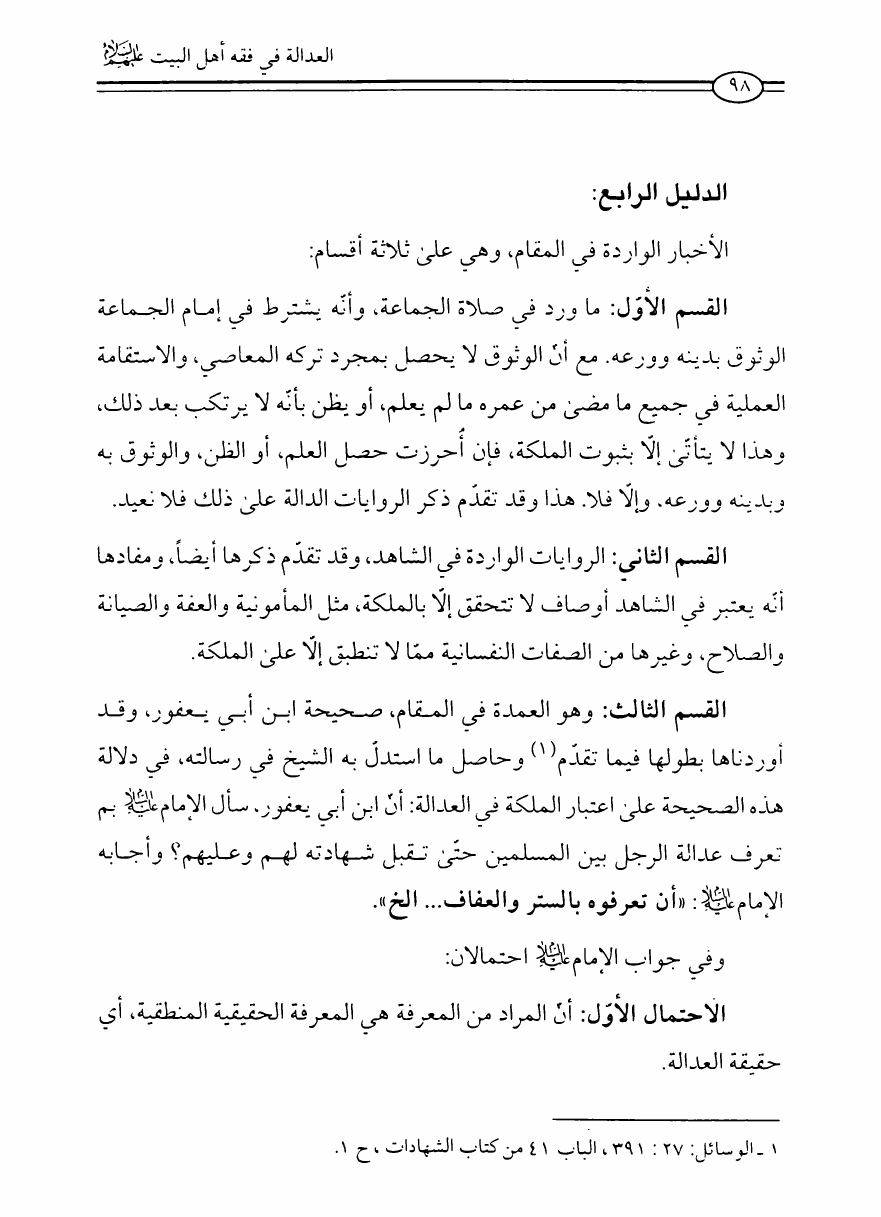 نام کتاب : العدالة في فقه أهل البيت عليهم السلام، تقريراً لبحث أية الله الحاج الشيخ مسلم الداوري نویسنده : الشيخ محمد علي صالح المعلم جلد : 1 صفحه : 98