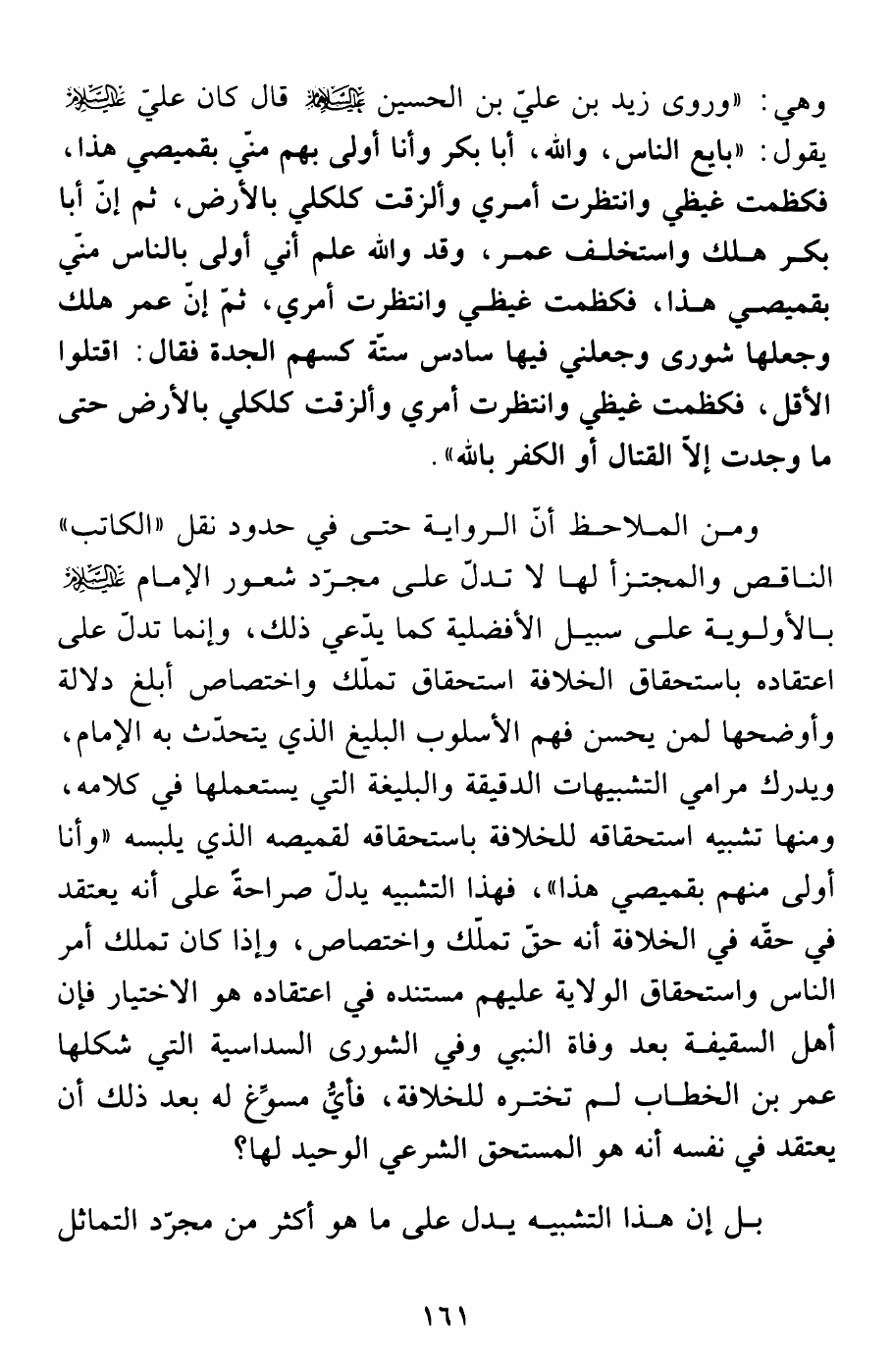 نام کتاب : التشيع المفترى عليه ، مداخلات وهوامش نقدية على كتاب (تطور الفكر السياسي الشيعي من الشورى إلى ولاية الفقيه) نویسنده : خالد ابا ذر العطية جلد : 1 صفحه : 161
