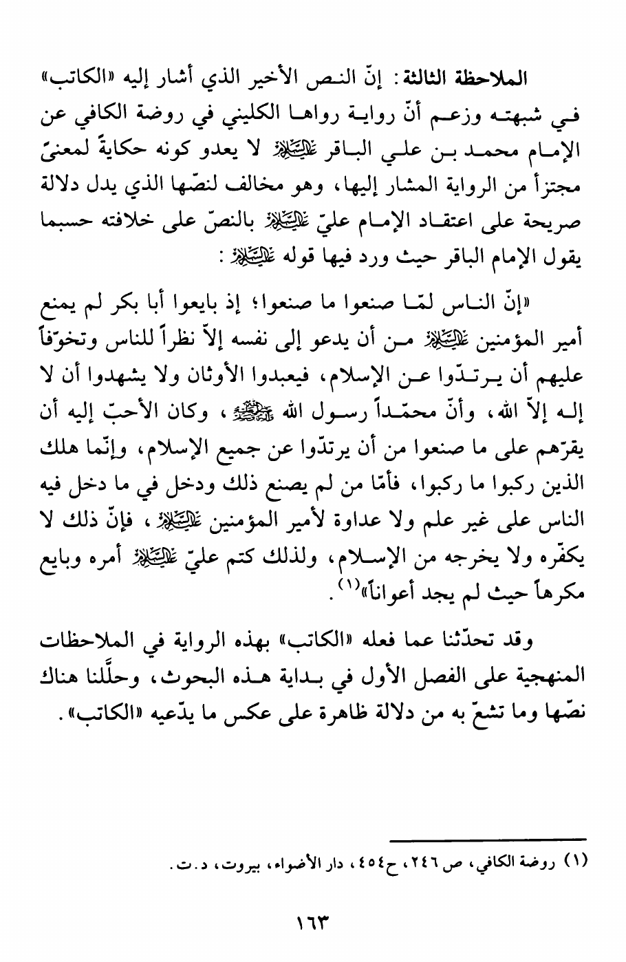 نام کتاب : التشيع المفترى عليه ، مداخلات وهوامش نقدية على كتاب (تطور الفكر السياسي الشيعي من الشورى إلى ولاية الفقيه) نویسنده : خالد ابا ذر العطية جلد : 1 صفحه : 163