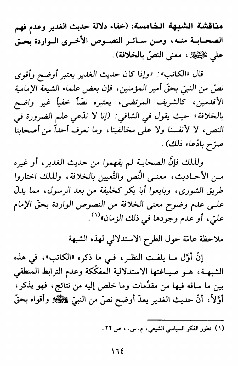 نام کتاب : التشيع المفترى عليه ، مداخلات وهوامش نقدية على كتاب (تطور الفكر السياسي الشيعي من الشورى إلى ولاية الفقيه) نویسنده : خالد ابا ذر العطية جلد : 1 صفحه : 164