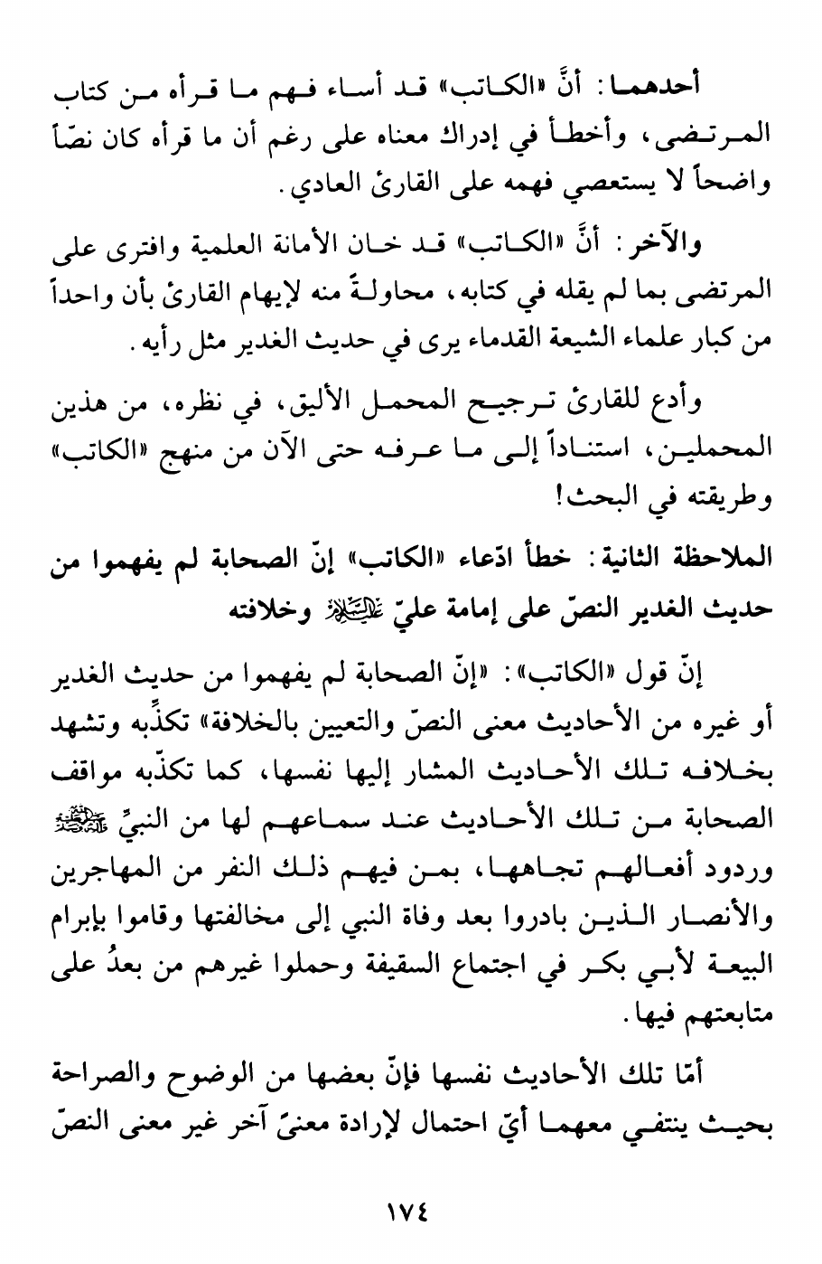 نام کتاب : التشيع المفترى عليه ، مداخلات وهوامش نقدية على كتاب (تطور الفكر السياسي الشيعي من الشورى إلى ولاية الفقيه) نویسنده : خالد ابا ذر العطية جلد : 1 صفحه : 174