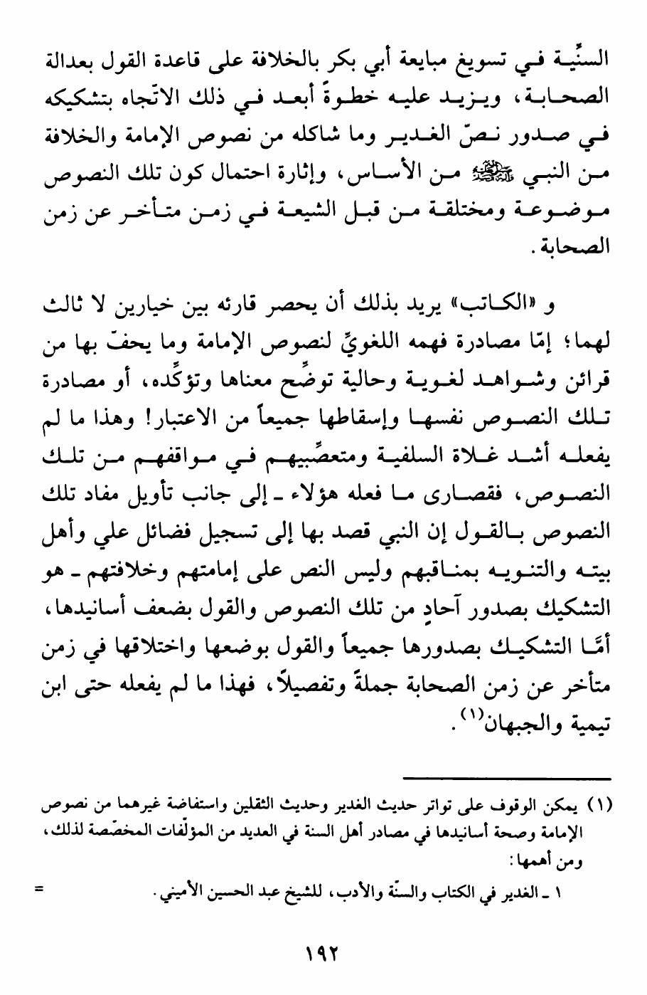 نام کتاب : التشيع المفترى عليه ، مداخلات وهوامش نقدية على كتاب (تطور الفكر السياسي الشيعي من الشورى إلى ولاية الفقيه) نویسنده : خالد ابا ذر العطية جلد : 1 صفحه : 192