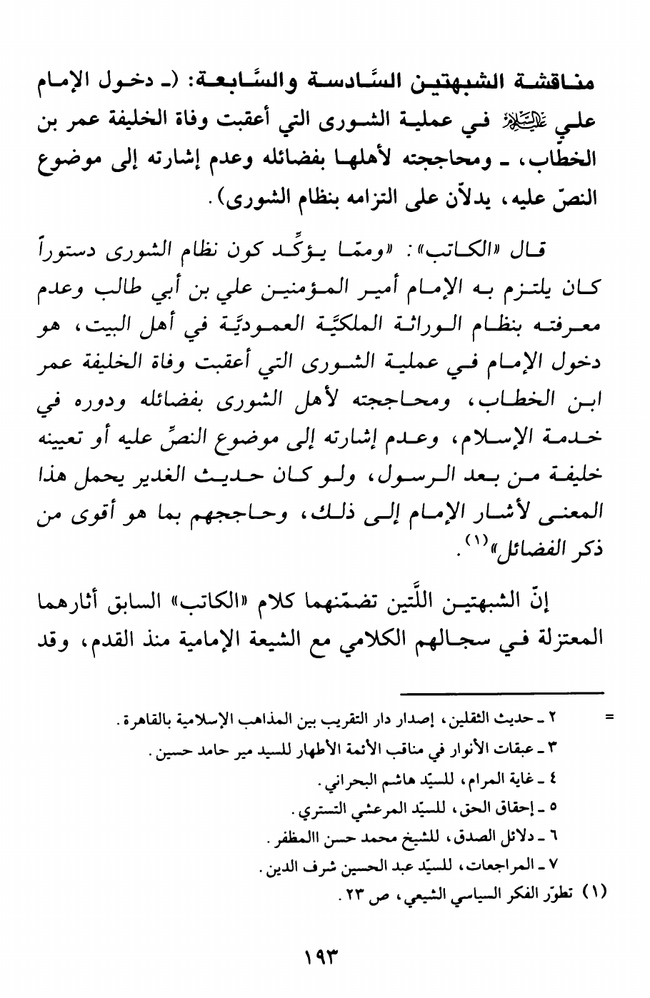 نام کتاب : التشيع المفترى عليه ، مداخلات وهوامش نقدية على كتاب (تطور الفكر السياسي الشيعي من الشورى إلى ولاية الفقيه) نویسنده : خالد ابا ذر العطية جلد : 1 صفحه : 193