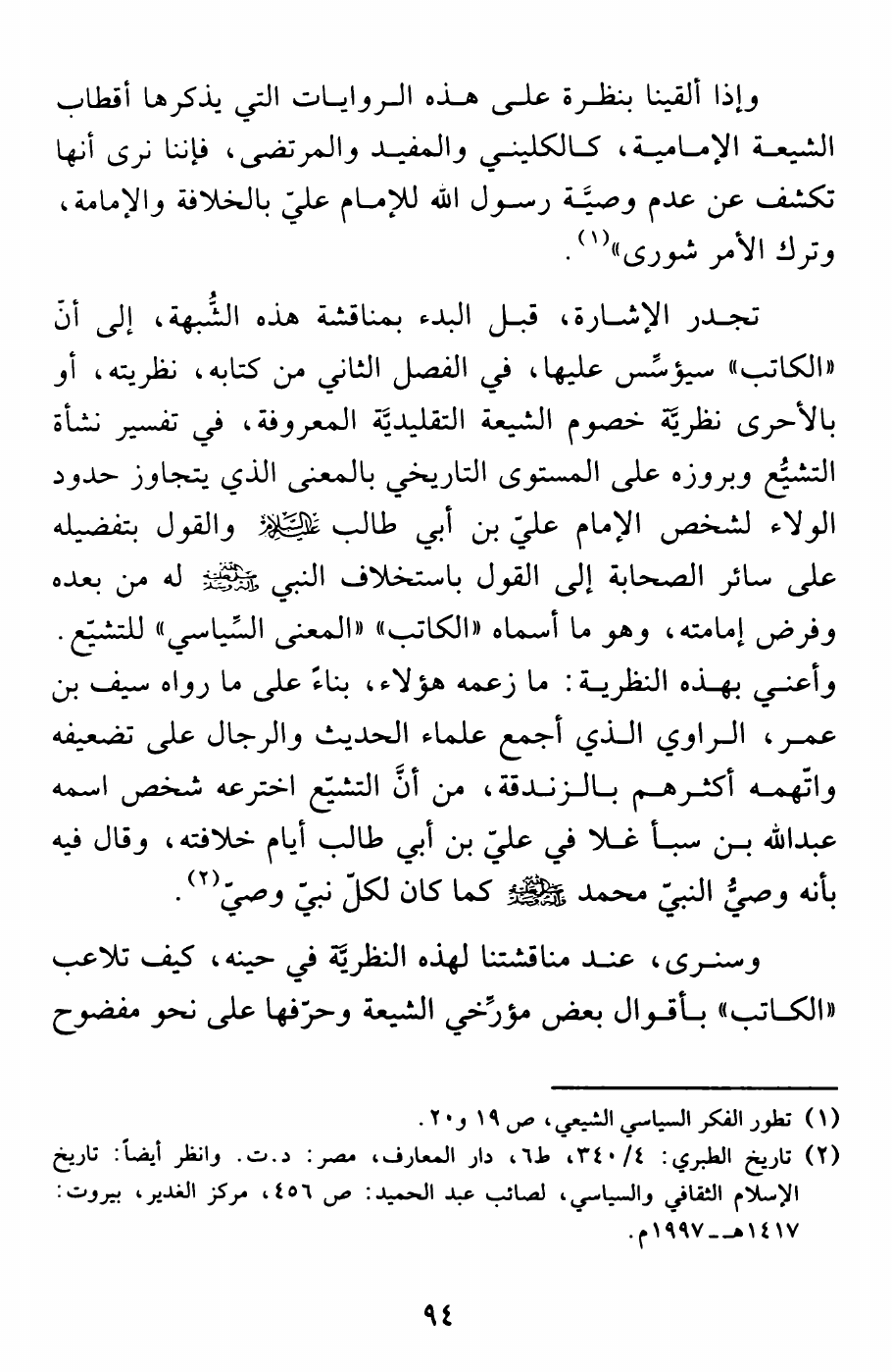 نام کتاب : التشيع المفترى عليه ، مداخلات وهوامش نقدية على كتاب (تطور الفكر السياسي الشيعي من الشورى إلى ولاية الفقيه) نویسنده : خالد ابا ذر العطية جلد : 1 صفحه : 94