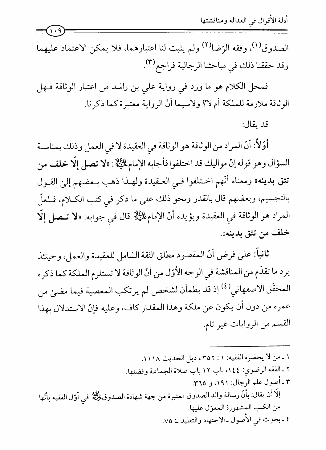 نام کتاب : العدالة في فقه أهل البيت عليهم السلام، تقريراً لبحث أية الله الحاج الشيخ مسلم الداوري نویسنده : الشيخ محمد علي صالح المعلم جلد : 1 صفحه : 109