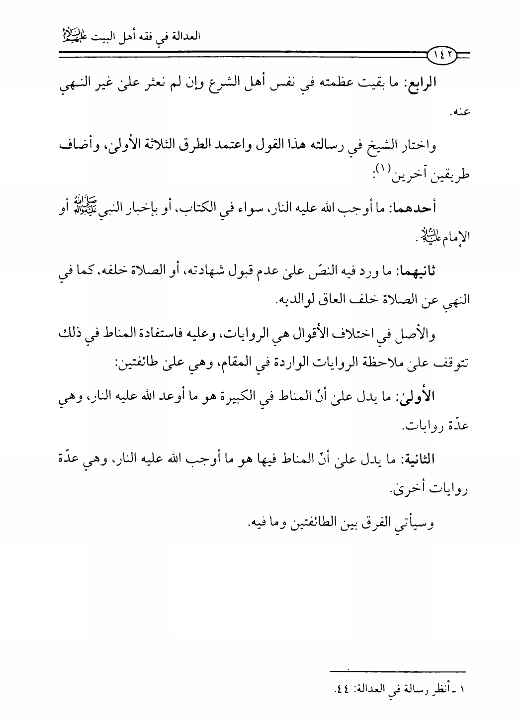 نام کتاب : العدالة في فقه أهل البيت عليهم السلام، تقريراً لبحث أية الله الحاج الشيخ مسلم الداوري نویسنده : الشيخ محمد علي صالح المعلم جلد : 1 صفحه : 142