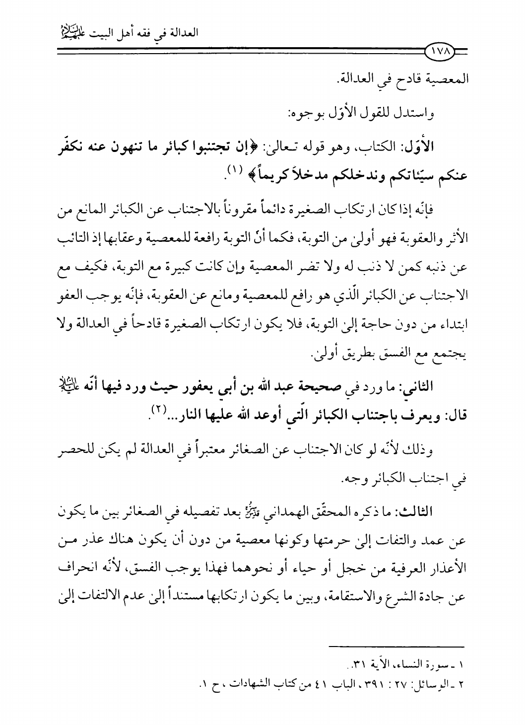 نام کتاب : العدالة في فقه أهل البيت عليهم السلام، تقريراً لبحث أية الله الحاج الشيخ مسلم الداوري نویسنده : الشيخ محمد علي صالح المعلم جلد : 1 صفحه : 178