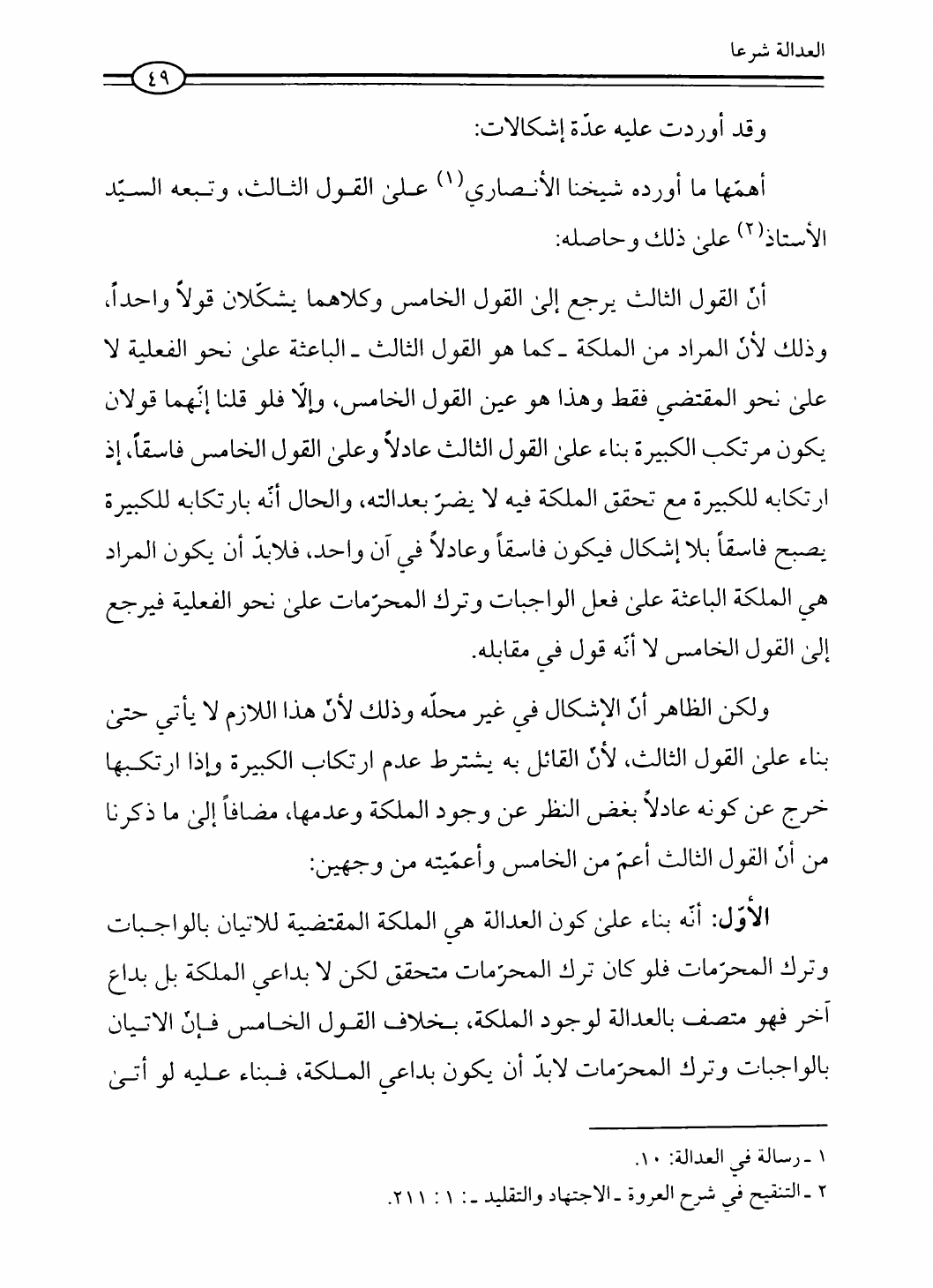 نام کتاب : العدالة في فقه أهل البيت عليهم السلام، تقريراً لبحث أية الله الحاج الشيخ مسلم الداوري نویسنده : الشيخ محمد علي صالح المعلم جلد : 1 صفحه : 49