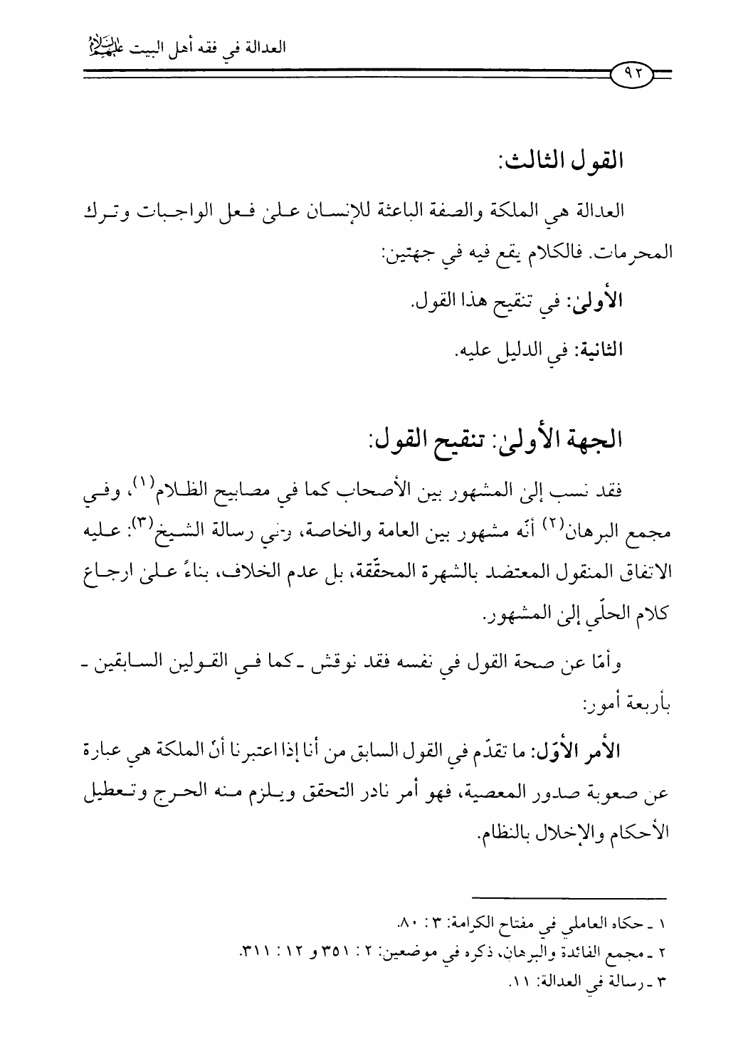 نام کتاب : العدالة في فقه أهل البيت عليهم السلام، تقريراً لبحث أية الله الحاج الشيخ مسلم الداوري نویسنده : الشيخ محمد علي صالح المعلم جلد : 1 صفحه : 92